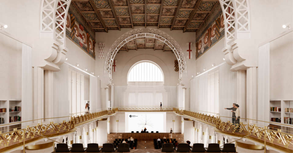 Zelfs de grote zaal op de eerste verdieping wordt gerestaureerd en omgebouwd tot een multifunctioneel auditorium met uitschuifbare tribunes, waardoor de ruimte geschikt is voor zowel wetenschappelijke conferenties als culturele evenementen en visueel wordt geïntegreerd met de bovenste galerijen.